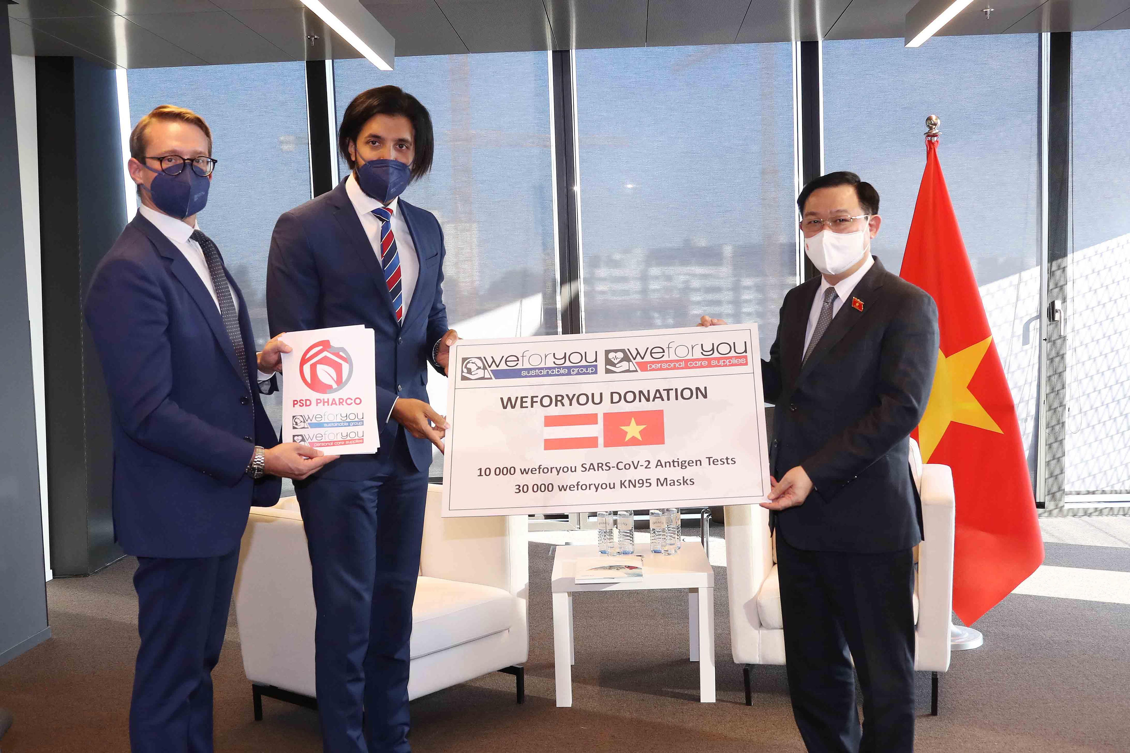 Trong đó, Tập đoàn WEFORYOU trao tặng Việt Nam 30 nghìn khẩu trang y tế N95, 10 nghìn bộ kit xét nghiệm kháng nguyên. Chủ tịch QH cảm ơn Tập đoàn đã dành tặng những vật phẩm thiết yếu cho Việt Nam chống dịch; đề nghị WEFORYOU phối hợp và trao đổi chặt chẽ với Đại sứ quán Việt Nam tại Áo, bộ ngành hữu quan để triển khai dự án thành công và hiệu quả tại Việt Nam.