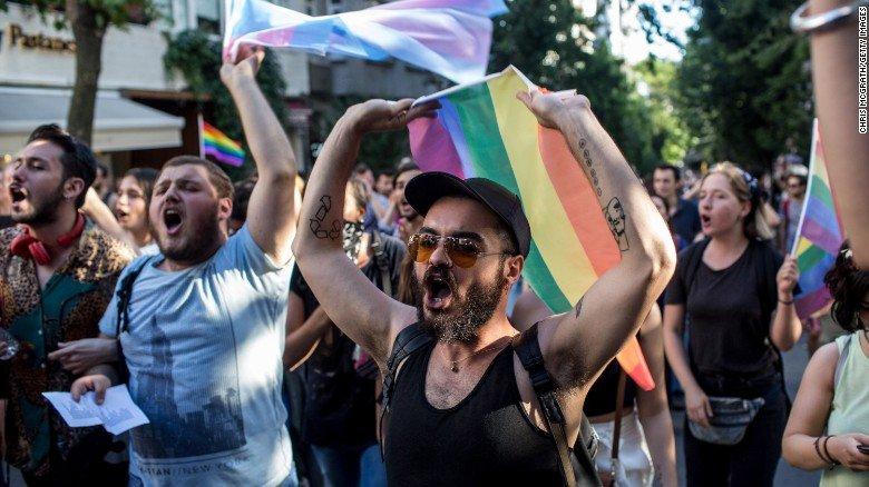 Những người tham gia buổi diễu hành Tự hào vào ngày 25/6/2017 tại Istanbul, Thổ Nhĩ Kỳ, trước khi bị cảnh sát giải tán. |