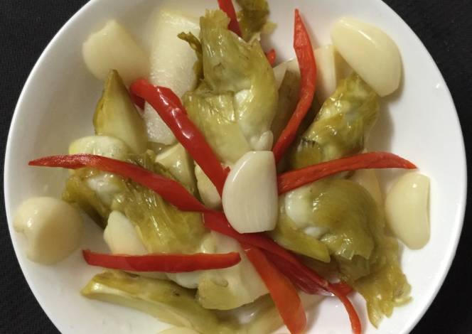 Sau đó, bạn cho cải mầm đá vào âu lớn, thêm tỏi, ớt thái lát, hỗn hợp nước giấm đường và chút muối đã đun sôi, đậy kín khoảng 1 ngày là ăn được nhé!