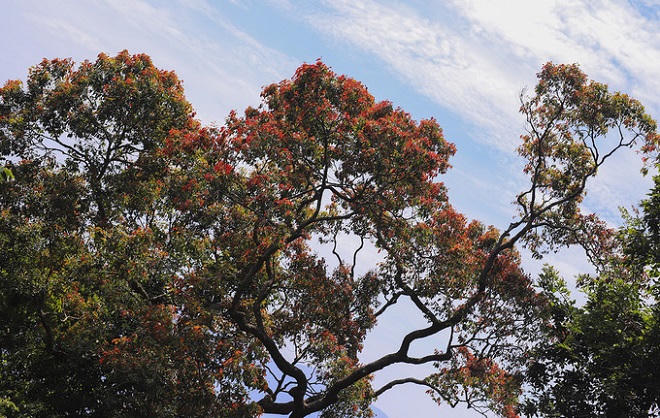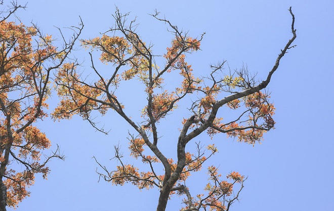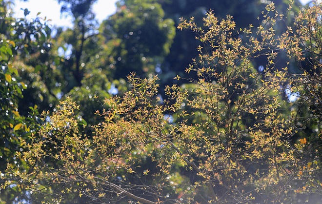 Lộc non của một cây cổ thu nhìn từ xa như những bông hoa màu đỏ.