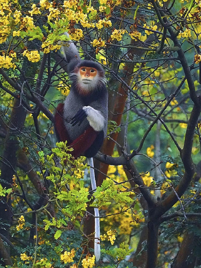 Voọc chà vá chân nâu tìm lộc non làm thức ăn trên cây lim xẹt. Theo Tổ chức Bảo tồn thiên nhiên quốc tế (IUCN), voọc chân nâu đang đối diện với nguy cơ tuyệt chủng cao, đứng thứ hai trong danh lục đỏ của IUCN về các loài bị đe dọa. Ảnh: Lê Phước Chín.