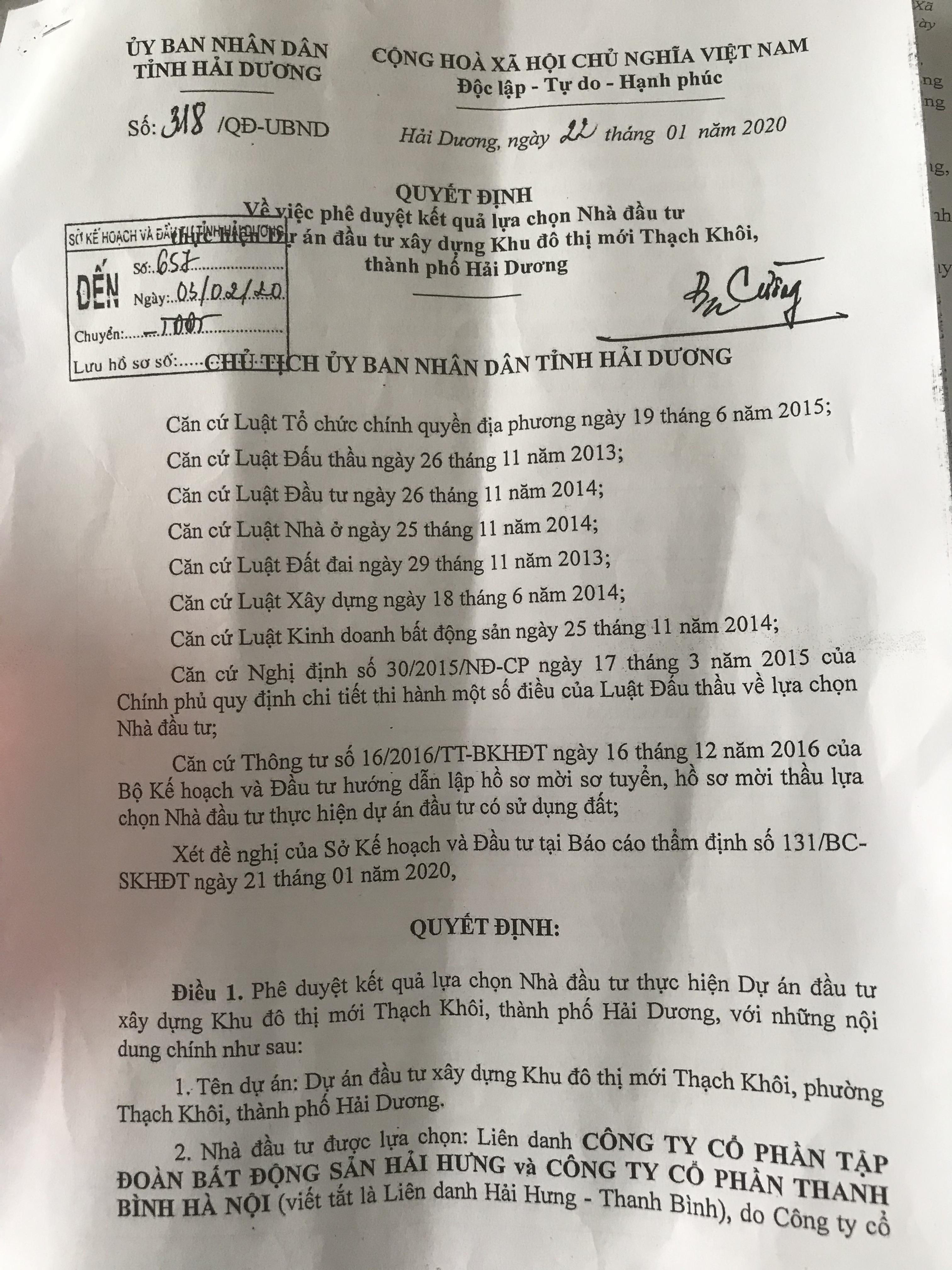 Được biết, ngày 22/01/2020, UBND tỉnh Hải Dương có Quyết định phê duyệt duyệt kết quả lựa chọn nhà đầu tư Dự án Khu đô thị mới Thạch Khôi, phường Thạch Khôi, TP Hải Dương. Địa điểm thực hiện dự án trên địa bàn xã Tân Hưng và phường Thạch Khôi, với diện tích trên 30ha, gồm đất ở, đất ở liền kề, đất ở biệt thự, đất ở nhà xã hội (chung cư), đất nhà văn hóa, đất trường mầm non, đất công viên mặt nước, cây xanh…