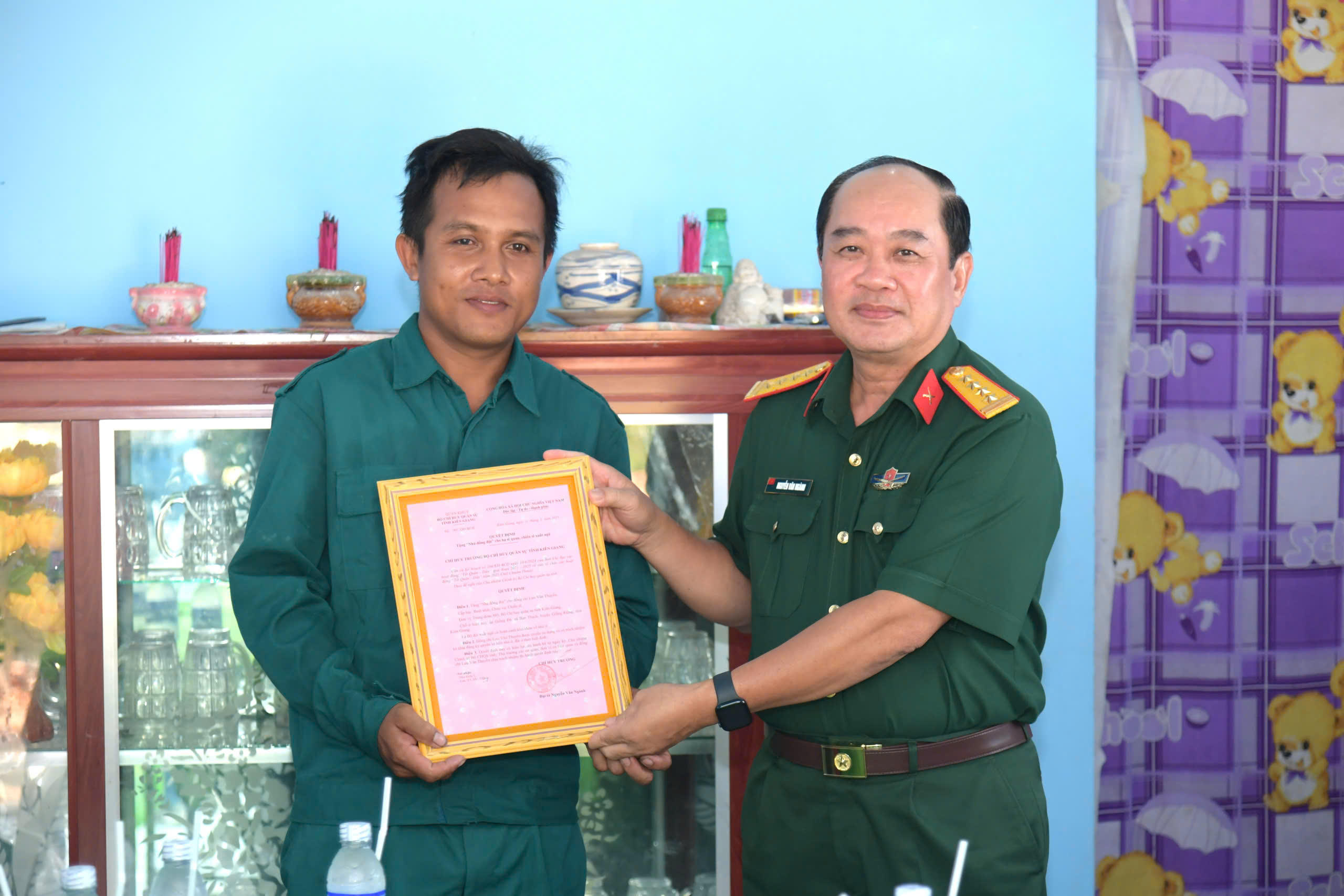 Đại tá Nguyễn Văn Ngành - Ủy viên Ban Thường vụ Tỉnh ủy, Chỉ huy trưởng Bộ Chỉ huy Quân sự tỉnh Kiên Giang trao Quyết định bàn giao nhà đồng đội cho ông Lưu Văn Thuyền, ấp Giồng Đá, xã Bàn Thạch |