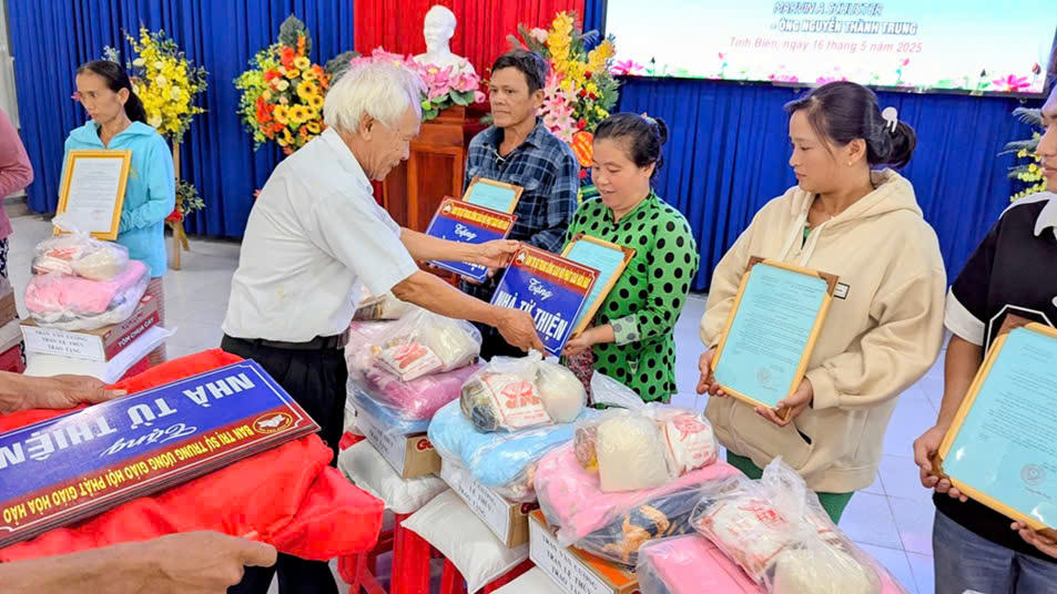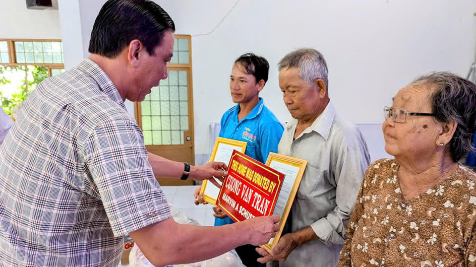 Tại buổi Lễ bàn giao nhà, 94 hộ dân còn được mạnh thường quân trao tặng một phần quà gồm: gạo, mì gói, đường và các nhu yếu phẩm sử dụng trong sinh hoạt hằng ngày, trị giá mỗi phần quà 500.000 đồng.