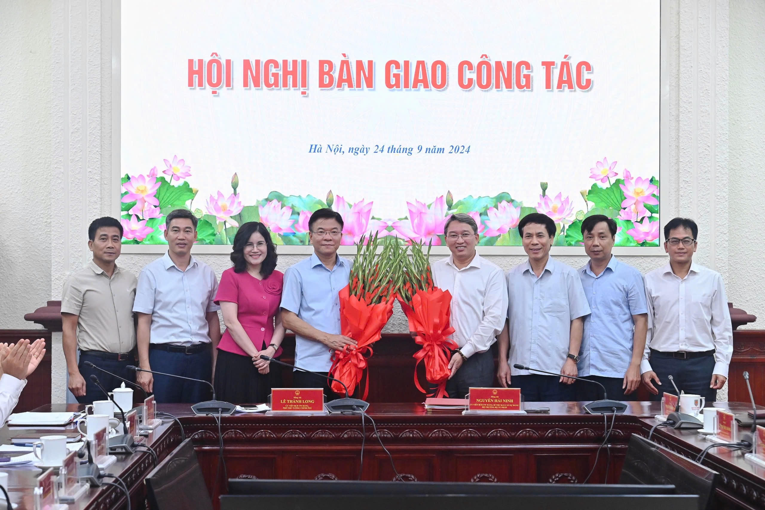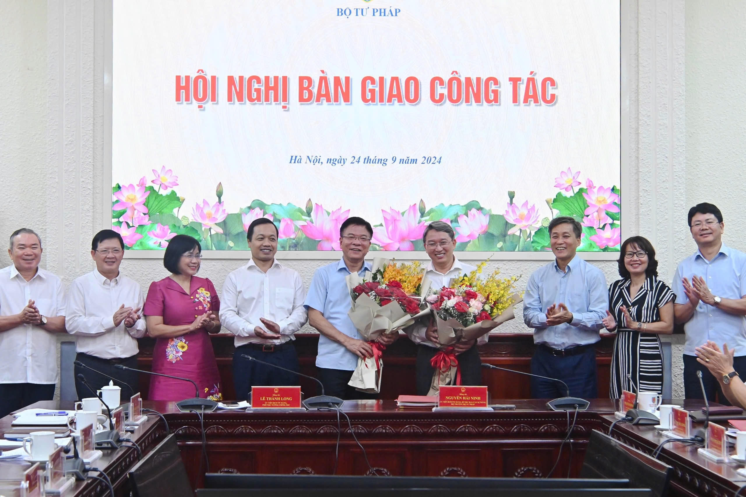 (PLVN) - Ngày 24/9, Bộ Tư pháp đã tổ chức Hội nghị bàn giao công tác giữa đồng chí Lê Thành Long, Uỷ viên Ban Chấp hành TW Đảng, Phó Thủ tướng Chính phủ, nguyên Bộ trưởng Bộ Tư pháp và đồng chí Nguyễn Hải Ninh, Uỷ viên Ban Chấp hành TW Đảng, Bí thư Ban Cán sự Đảng, Bộ trưởng Bộ Tư pháp.