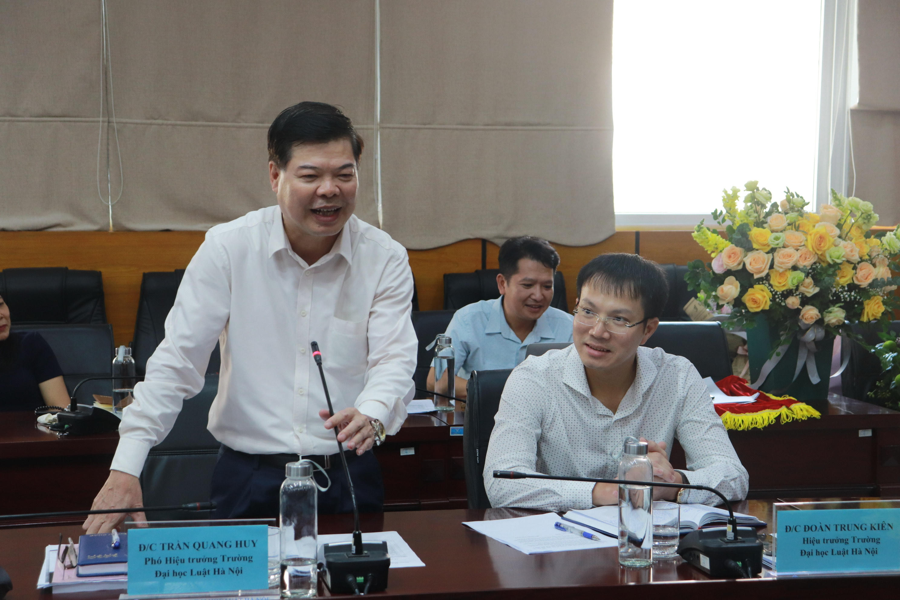 Tại Lễ bàn giao công tác, Phó Hiệu trưởng Trần Quang Huy đã gửi lời cảm ơn Ban Cán sự Đảng, lãnh đạo Bộ Tư pháp, Đảng ủy, lãnh đạo Nhà trường đã cùng đồng hành, gánh vác, chia sẻ công việc của Nhà trường trong suốt thời gian vừa qua. Bày tỏ mong muốn đoàn kết, gắn bó, đồng thuận và nỗ lực của Đảng ủy, Ban Giám hiệu và đội ngũ cán bộ chủ chốt trong tương lai, đồng chí Trần Quang Huy hy vọng sau khi kiện toàn được Ban Giám hiệu, Trường Đại học Luật Hà Nội đoàn kết, tập trung quyết liệt thực hiện các nhiệm vụ, giải pháp theo chủ trương và kế hoạch đã đề ra.