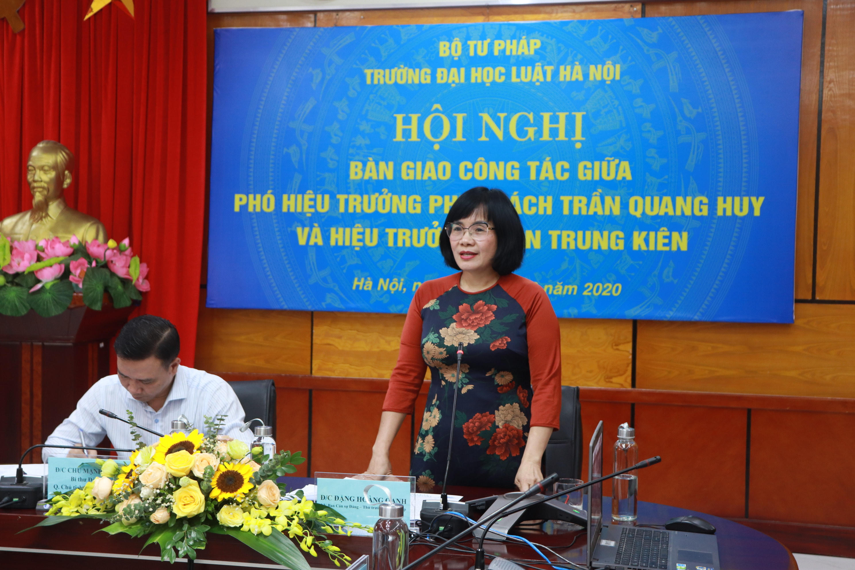 Phát biểu tại Lễ bàn giao, Thứ trưởng Đặng Hoàng Oanh đã đánh giá cao kết quả công tác và đóng góp của đồng chí Trần Quang Huy trên cương vị Phó Hiệu trưởng Nhà trường, đồng thời chúc mừng đồng chí Đoàn Trung Kiên đã được cấp trên tin tưởng, giao nhiệm vụ làm Hiệu trưởng Nhà trường.