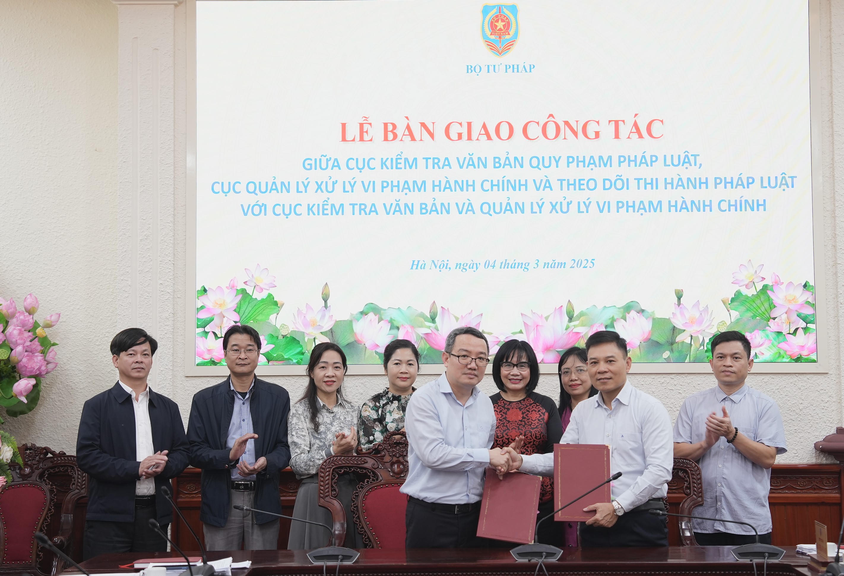 Cục Kiểm tra Văn bản Quy phạm pháp luật, Cục Quản lý xử lý vi phạm hành chính và theo dõi thi hành pháp luật với Cục Kiểm tra văn bản và Quản lý xử lý vi phạm hành chính ký biên bản bàn giao. |