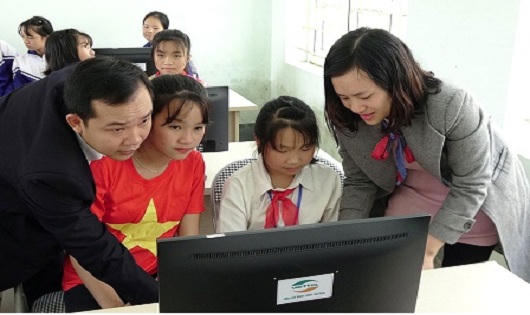 | Thầy và trò trường THCS Bán trú Tam Chung (Mường Lát, Thanh Hóa) hào hứng trải nghiệm phòng máy mới. |