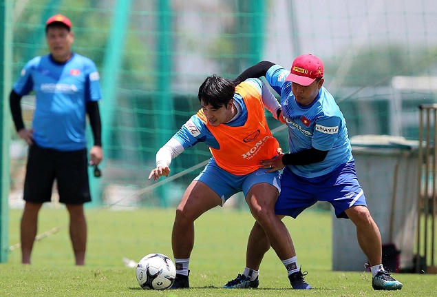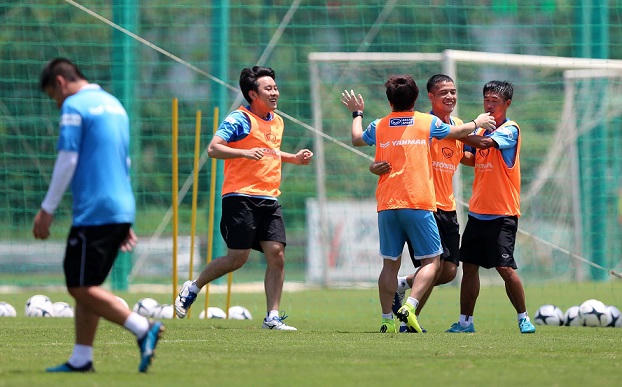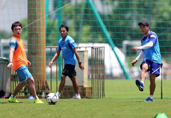 Trợ lý Nguyễn Đức Cảnh sắm vai trọng tài trong khi HLV trưởng Park Hang-seo là giám sát trận đấu.