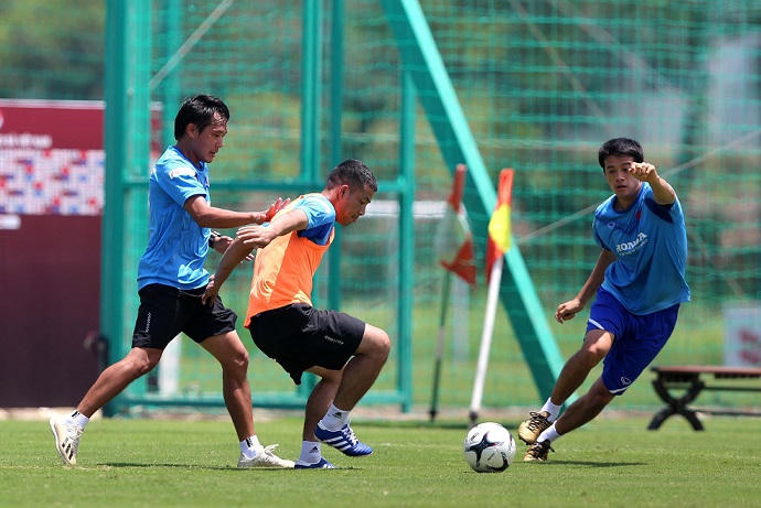 Sau khi kết thúc buổi tập, các thành viên BHL ĐT U22 Việt Nam đã chia đôi đội hình đá giao hữu 7x7. Đội áo xanh gồm: Trợ lý Lee Young-jin, Lưu Danh Minh, Ngô Tuấn Vinh, Lê Huy Khoa, Su Young Ahn, bác sỹ Trần Huy Thọ và kitman Đinh Kim Tuấn.