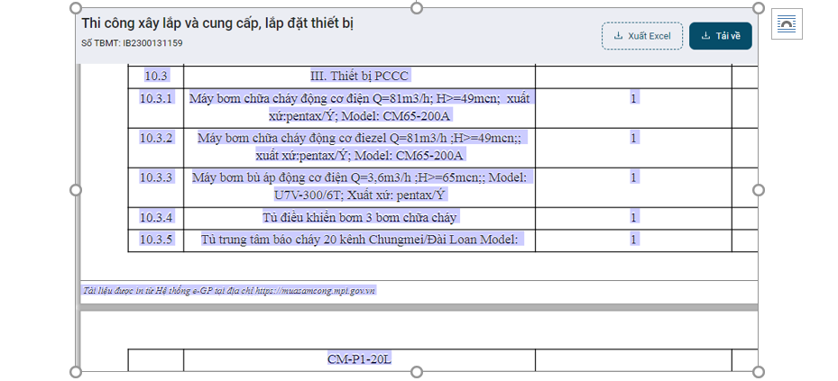Máy bơm bù áp động cơ điện Q=3,6m3/h; H>=65mcn; Model: U7V-300/6T; Xuất xứ: pentax/ Ý. Máy bơm chữa cháy động cơ diezel Q=81m3/h; H>=49mcn; xuất xứ: pentax/Ý; Model: CM65-200A. Tủ trung tâm báo cháy 20 kênh Chungmei/Đài Loan Model: CM-P1-20L.