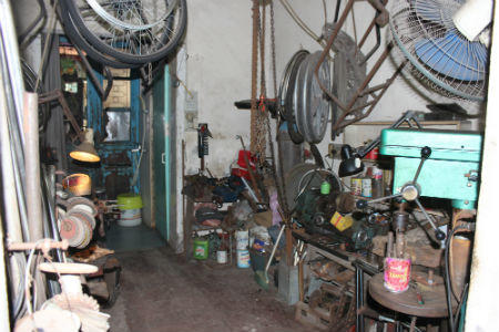 Căn phòng làm việc của ông Trung ngổn ngang không ít dụng cụ đồ nghề của một thợ hàn. Gọi là phòng làm việc cho “sang”, kỳ thực nó chỉ rộng chưa đầy chục mét vuông. Với một diện tích khiêm tốn như vậy, để xếp ngăn nắp đồ nghề, ông Trung sáng kiến ra cách treo lủng lẳng tất cả chúng lên tường. Phía tường bên tay phải ông chất đầy những bánh xe to, nhỏ, vòng xích, tay cầm, còn riêng bên trái thì xếp inox, nhôm...