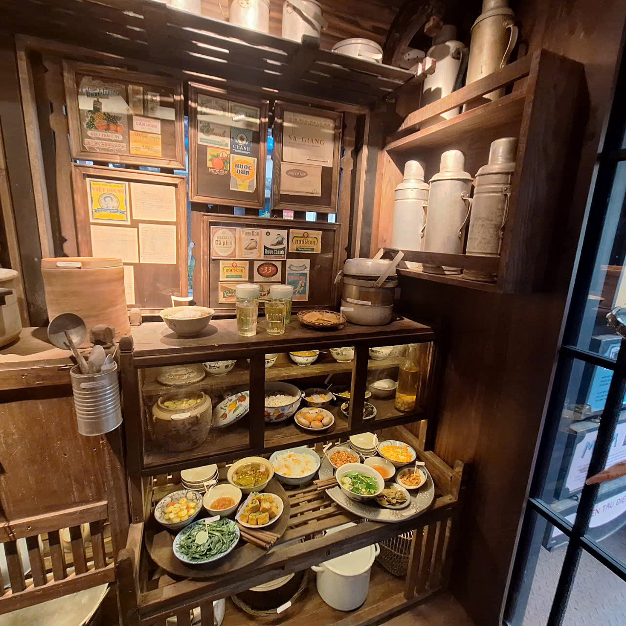 Tại đây còn treo nhiều bức ảnh về Hà Nội, những ký ức xưa. Để gọi món, nếu vào giờ quán đông khách, thì phải xếp hàng chờ đến lượt, sau đó nhân viên sẽ ghi đồ ăn lên một tờ tem phiếu. Thực đơn được thiết kế giống sổ mua lương thực thời bao cấp, bìa ghi “Sổ đăng ký mua lương thực”. Ngay những món ăn cũng có thể khiến thực khách ở thế hệ trước xúc động khi đọc tên như: Cơm độn khoai, bánh đúc, phở không người lái, phở trộn cơm nguội, dưa xào tóp mỡ...