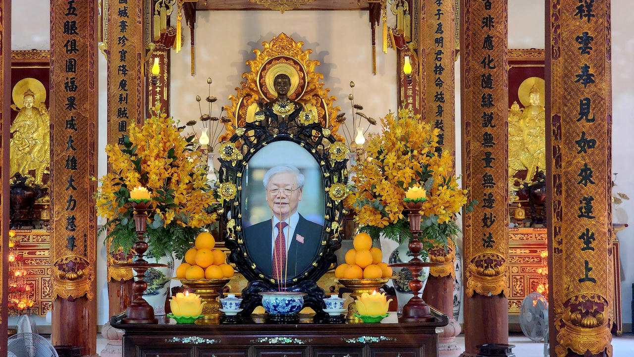 Án thờ Tổng Bí thư Nguyễn Phú Trọng được thiết trí tôn nghiêm tại Bảo điện Tổ đình Từ Đàm trong 2 ngày Quốc tang 25 và 26/7/2024.