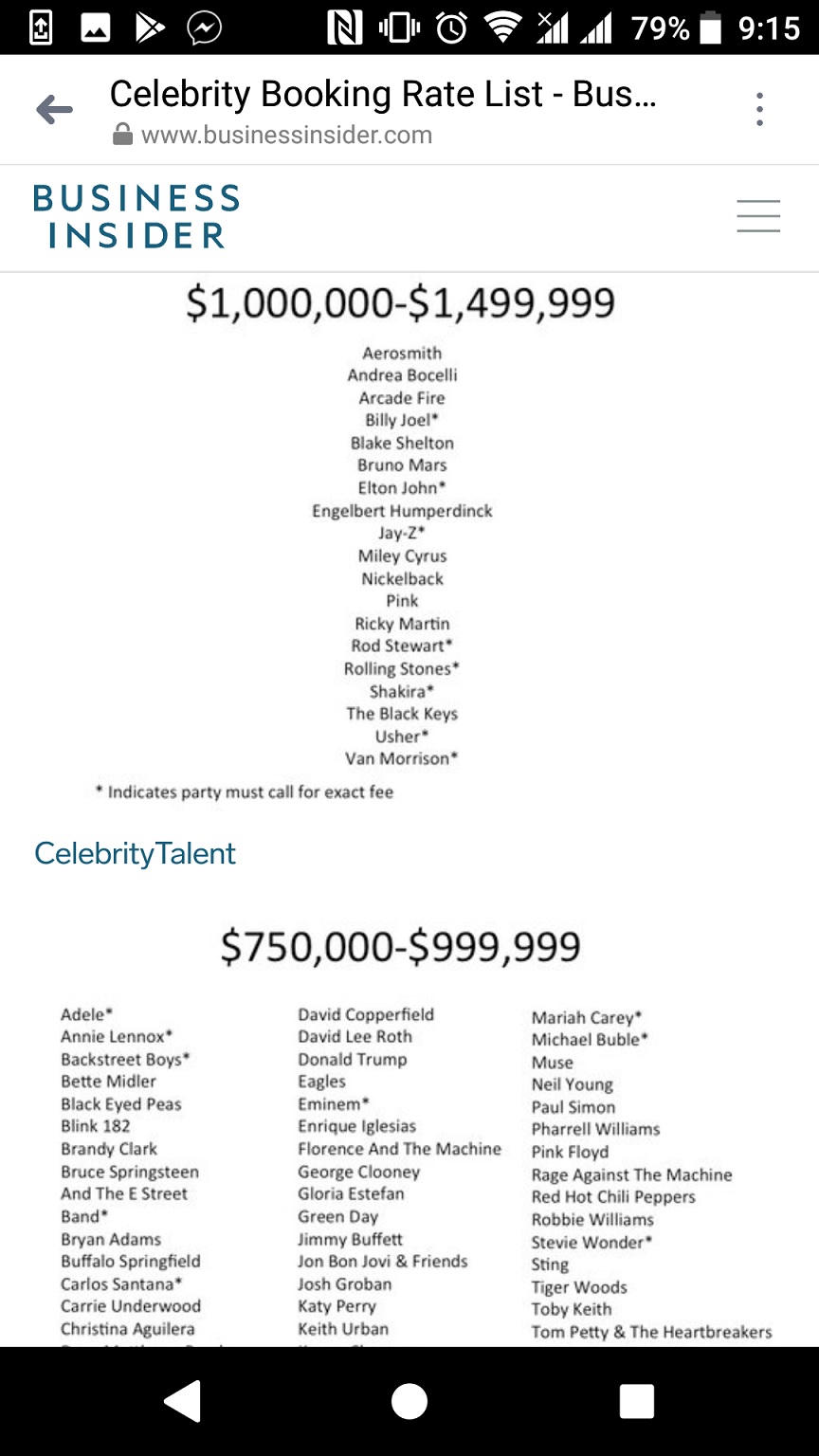 Giá tham dự sự kiện của sao quốc tế không thể biết mức chính xác được và luôn mập mờ. Vì họ hay chính xác là agent của họ không công bố con số mà dùng chiêu trò làm ăn và làm giá để thương lượng với đối tác.
