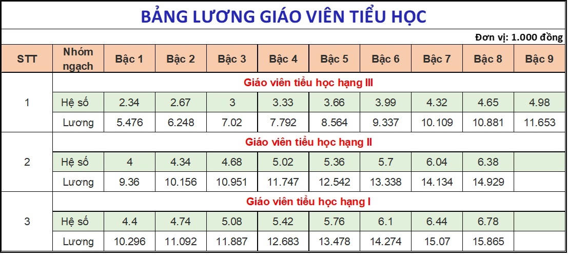 Dự kiến Bảng lương giáo viên Tiểu học từ 1/7/2024