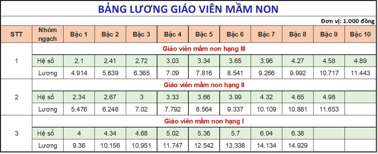 Dự kiến Bảng lương giáo viên Mầm non từ 1/7/2024