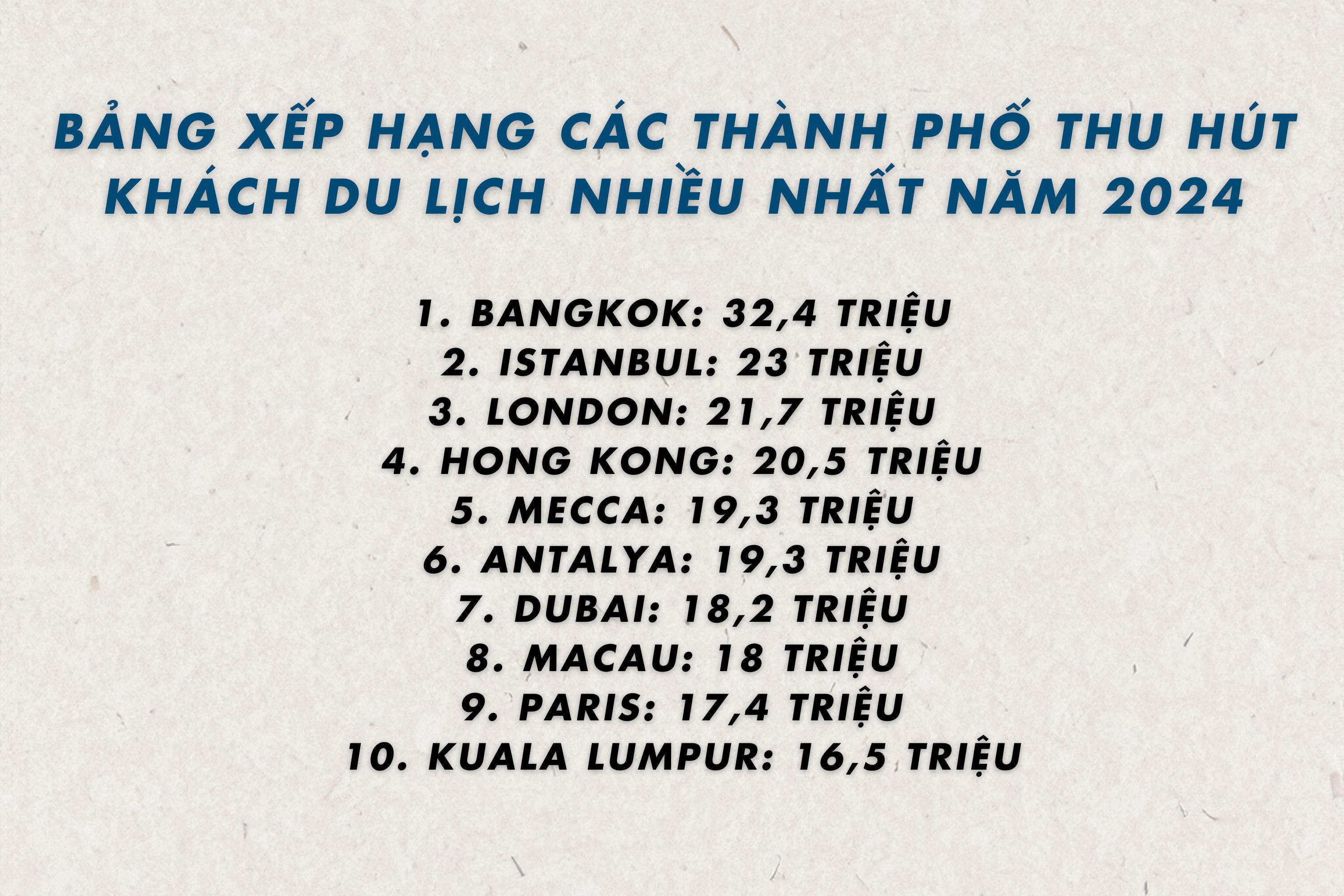 Tuy nhiên, khi được đánh giá dựa trên sáu yếu tố quan trọng – hiệu suất kinh tế và du lịch kinh doanh, cơ sở hạ tầng, chính sách và sức hấp dẫn, y tế và an toàn, cùng tính bền vững – Bangkok lại không lọt vào top 10 điểm đến hấp dẫn nhất. Paris dẫn đầu danh sách này, tiếp theo là Madrid và Tokyo.