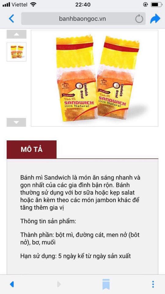 Tuy nhiên, sản phẩm bánh sandwich được mô tả thông tin sản phẩm trên Wesite của Bảo Ngọc (banhbaongoc.vn) có thời hạn sử dụng là 05 ngày kể từ ngày sản xuất nhưng đối chiếu với hạn sử dụng thực tế thời gian sử dụng lại kéo dài thêm tới 02 ngày (Ngày sản xuất thực là ngày 03/04/2018 (Bảo Ngọc ghi sai lệch thành ngày 04/04/2018, hạn sử dụng là ngày 10/04/2018).
