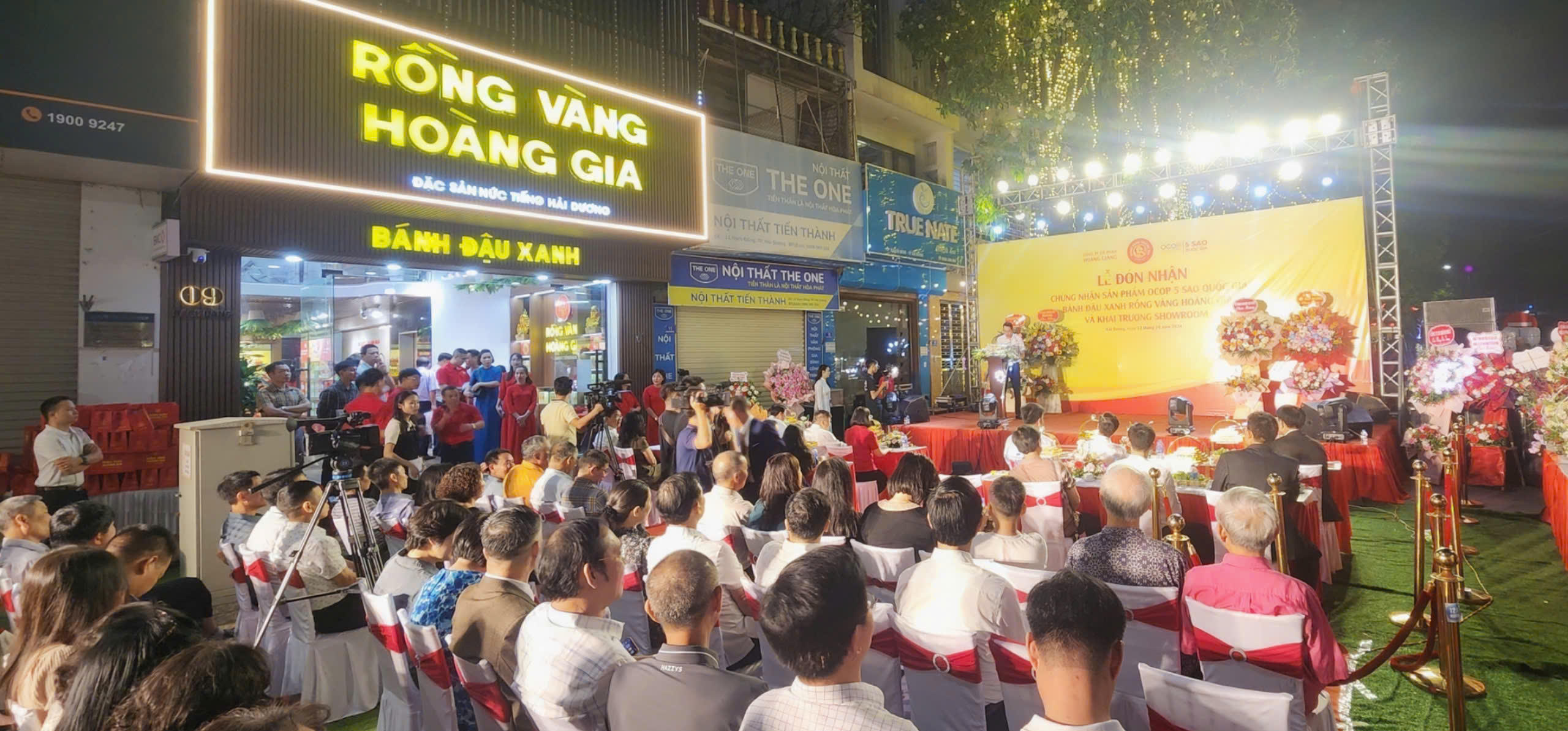 (PLVN) - Tối 12/10, lãnh đạo UBND tỉnh Hải Dương đã trao chứng nhận sản phẩm OCOP 5 sao quốc gia bánh đậu xanh rồng vàng Hoàng Gia cho CTCP Hoàng Giang. Tại đường Bạch Đằng - phố đi bộ của tỉnh Hải Dương, showroom mới của Công ty cũng chính thức khai trương.