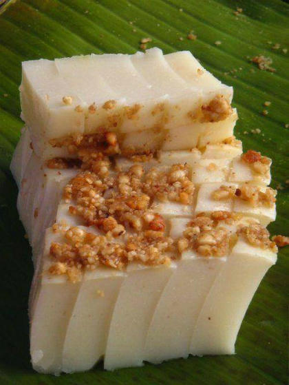 Bột được đổ ra một cái rổ tre lót lá chuối tươi, chờ đến khi nguội hoàn toàn mới cắt thành từng khối hình chữ nhật, tương đương hai đốt ngón tay.