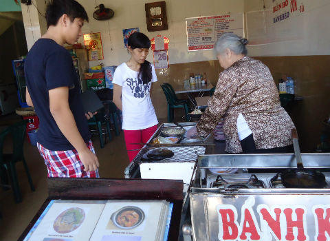 Tiếng xèo xèo vang lên cùng mùi thơm lừng thật khó cưỡng lại. Bánh chín vàng, gập đôi lại để trên chiếc đĩa sứ trắng tinh, nghi ngút khói. Màu vàng tươi của bột và trứng, màu đỏ của tôm, trắng của giá, hồng của chả, xanh của hành tạo nên ngũ sắc bắt mắt. “Bánh ở quán chúng tôi khi khách tới mới bắt đầu chế biến để ăn được nóng. Khách có thể học theo”, người cháu nói.