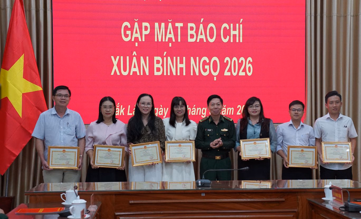 (PLVN) - Nhằm ghi nhận sự đồng hành, đóng góp của báo chí trong việc phản ánh kịp thời các hoạt động bảo vệ chủ quyền lãnh thổ và an ninh biên giới quốc gia, Ban Chỉ huy Bộ đội Biên phòng (BĐBP) tỉnh Đắk Lắk đã tặng giấy khen cho 25 cá nhân có thành tích xuất sắc trong công tác phối hợp tuyên truyền về biên giới năm 2025.