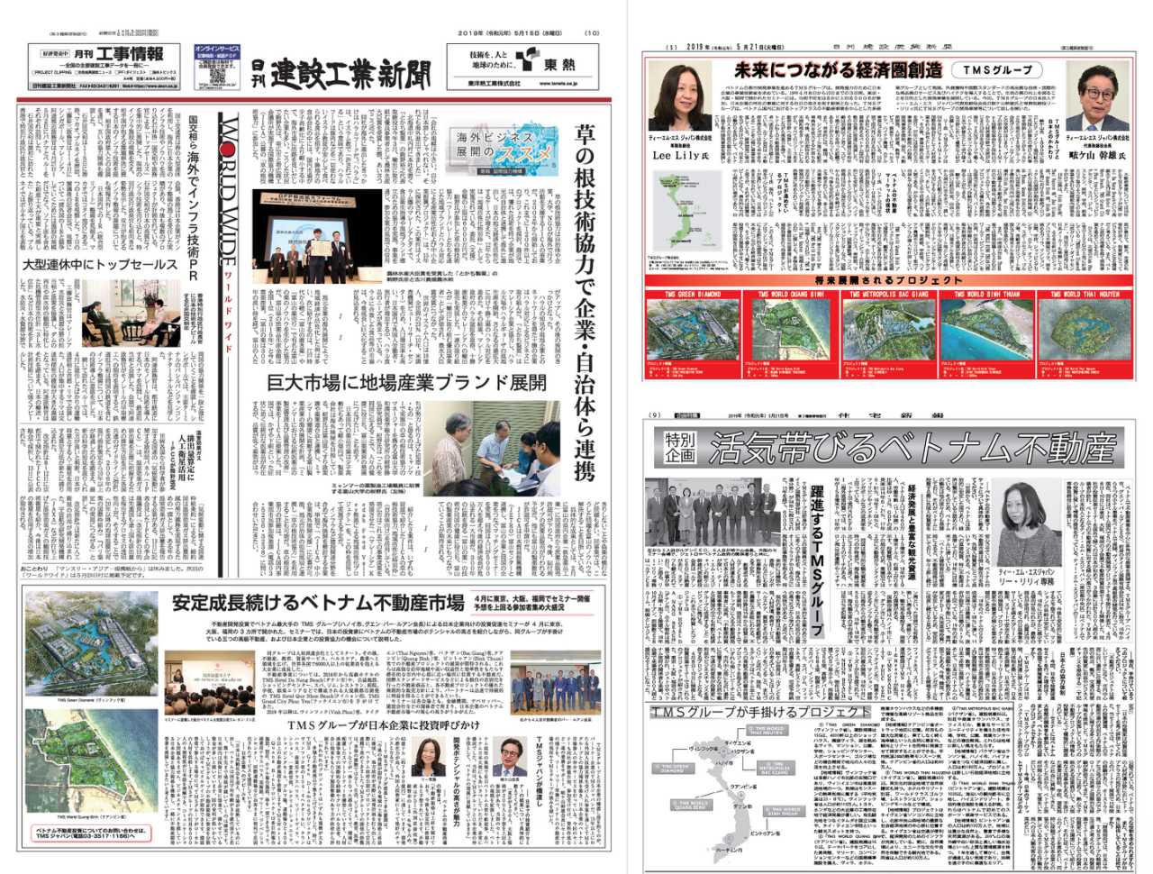 Cùng với đó, tờ Nikkan Kensetsu Sangyo Shinbun giới thiệu chuỗi sự kiện Hội thảo Xúc tiến đầu tư Nhật Bản do Tập đoàn TMS tổ chức từ 8 - 10/4 tại 3 thành phố Tokyo, Osaka và Fukuoka thu hút trên 500 doanh nghiệp Nhật Bản tham gia. Thông qua chuỗi hội thảo, Tập đoàn TMS đã cung cấp cho các nhà đầu tư Nhật Bản những thông tin hữu ích về môi trường đầu tư tại Việt Nam cũng như các xu hướng đầu tư mới trong lĩnh vực bất động sản, y tế, giáo dục và nông nghiệp công nghệ cao ở Việt Nam.