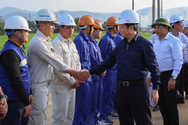 Phó Thủ tướng Trần Hồng Hà động viên cán bộ, công nhân, người lao động trên công trường dự án cao tốc đoạn Bãi Vọt-Hàm Nghi - Ảnh: VGP/Nhật Bắc