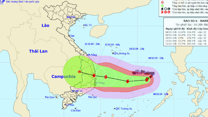 Trung tâm Dự báo Khí tượng Thủy văn Quốc gia dự báo trong 24 giờ tới, bão di chuyển theo hướng Tây Tây Nam, mỗi giờ đi được 5-10km và có khả năng mạnh thêm. Đến 13h ngày 9/11, vị trí tâm bão ở khoảng 12,4 độ Vĩ Bắc; 113,7 độ Kinh Đông, cách đảo Song Tử Tây khoảng 170km về phía Bắc Tây Bắc, cách bờ biển các tỉnh từ Quảng Ngãi đến Khánh Hòa khoảng 460km về phía Đông. Sức gió mạnh nhất vùng gần tâm bão mạnh cấp 12 (115-135km/giờ), giật cấp 15.