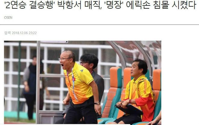 Trên tờ Chosun giật tít ca ngợi chiến lược gia 59 tuổi. “Ma thuật Park Hang Seo nhấn chìm HLV Eriksson bằng 2 chiến thắng liên tiếp.”
