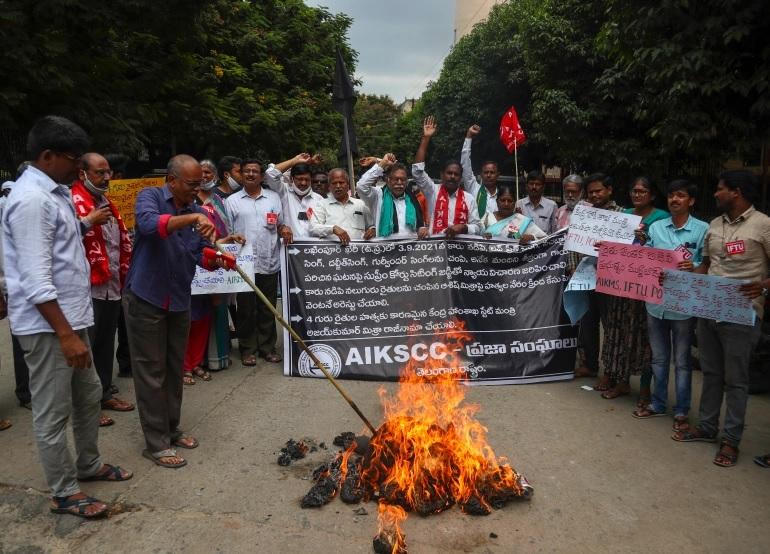 Các công đoàn nông trại ở Hyderabad phản đối các vụ nông dân bị thiệt mạng liên quan đến đoàn xe của quan chức Chính phủ hôm Chủ nhật. Ảnh: AP |