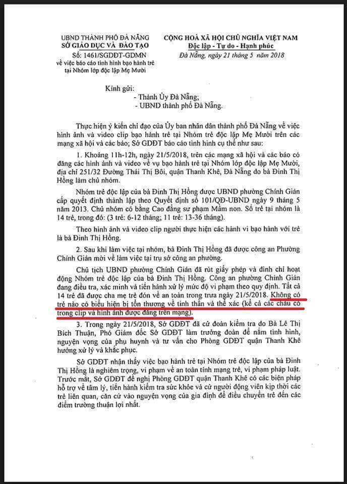 Điều đáng nói, sau khi báo chí phản ánh, trong báo cáo của cả Phòng GD-ĐT quận và Sở GD-ĐT TP.Đà Nẵng gửi cấp trên đều có đoạn y nguyên cho rằng “không có trẻ nào có biểu hiện bị tổn thương về tinh thần và thể xác” (kể cả các cháu có trong clip và hình ảnh được đăng trên mạng