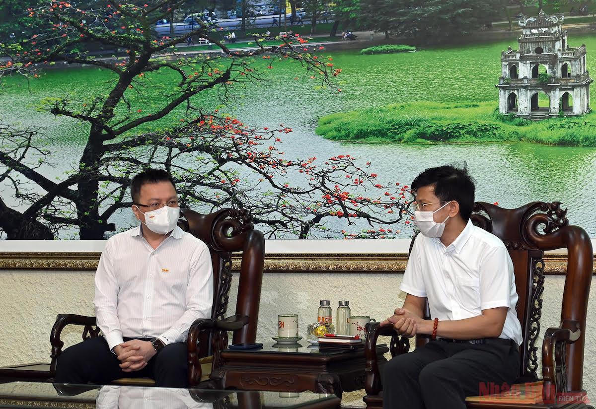 Tổng Biên tập Báo Nhân Dân Lê Quốc Minh trao đổi với GS, TS Hoàng Anh Tuấn, Hiệu trưởng Trường đại học Khoa học Xã hội và Nhân văn.