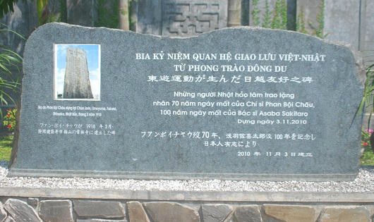Vào năm 2010, nhân dịp kỷ niêm 70 năm ngày mất cụ Phan Bội Châu và 100 năm ngày mất bác sĩ Asaba Sakitaro, những người Nhật hảo tâm đã tặng tấm bia kỷ niệm quan hệ giao lưu Việt Nhật từ phong trào Đông Du đặt trong khu vườn trước mộ cụ Phan Bội Châu.