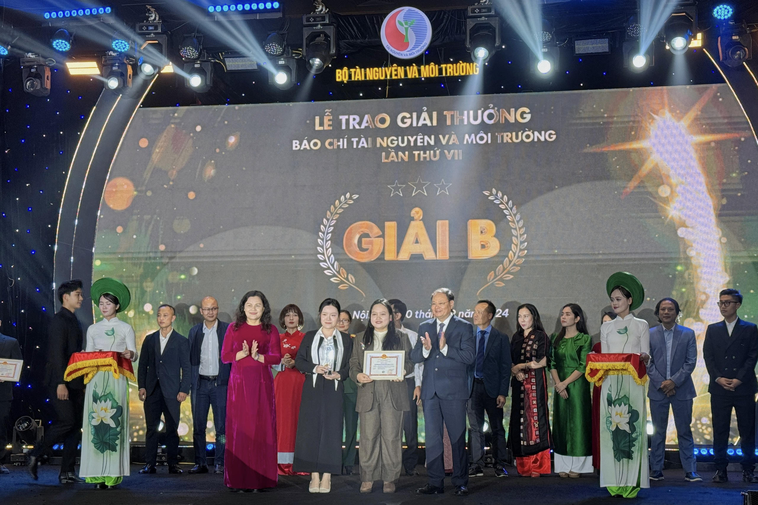 Đại diện nhóm tác giả Báo Pháp luật Việt Nam nhận giải tại Lễ trao Giải thưởng Báo chí tài nguyên và môi trường lần thứ VII. (Ảnh: Linh Chi) |