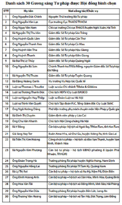 | Danh sách 30 Gương sáng Tư pháp được hội đồng bình chọn |