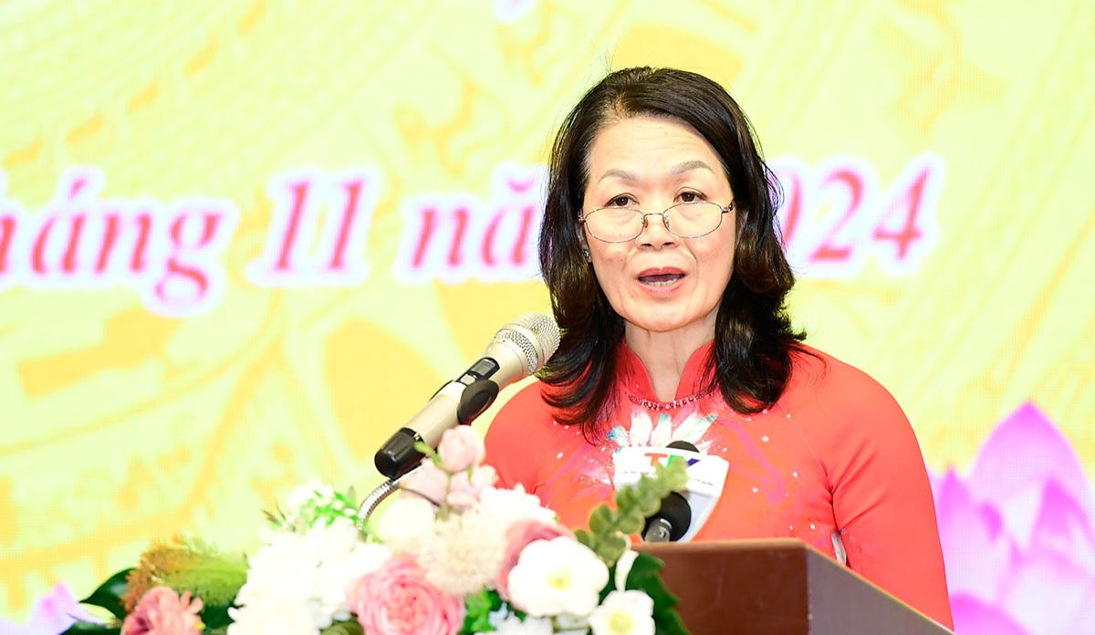 Bà Bùi Thị Hòa - Chủ tịch Trung ương Hội Chữ thập đỏ Việt Nam phát biểu tại hội nghị. Ảnh: Quốc Việt |