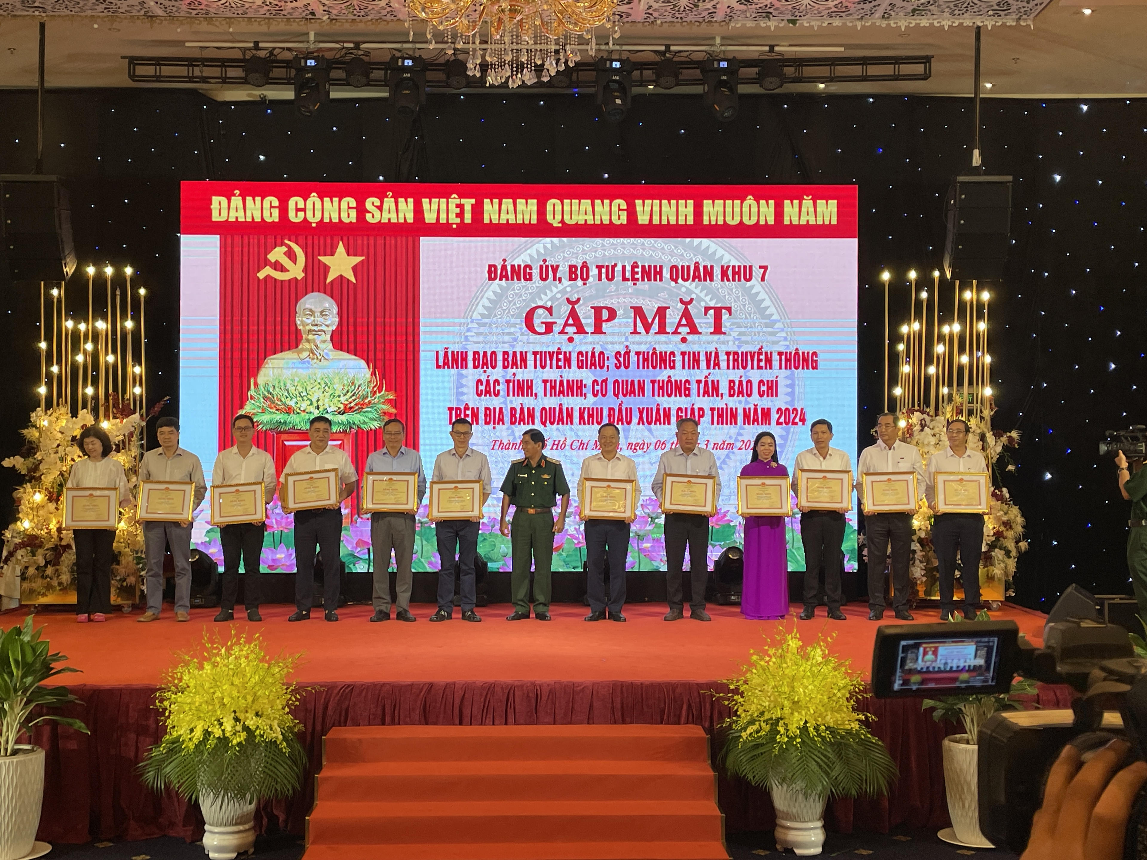 (PLVN) - Sáng 06/03/2024, Bộ tư lệnh Quân khu 7 tổ chức trọng thể buổi gặp mặt đầu năm với lãnh đạo tuyên giáo; sở Thông Tin và Truyền Thông các tỉnh thành; các cơ quan thông tấn báo chí trên địa bàn Quân khu đầu xuân Giáp Thìn 2024. Tại buổi Lễ, Bộ tư lệnh Quân khu 7 đã trao tặng bằng khen cho Báo Pháp luật Việt Nam - Trung tâm Truyền thông Pháp luật chi nhánh phía Nam vì “Đã có thành tích xuất sắc trong phối hợp tuyên truyền hoạt động của LLVT Quân khu năm 2023".