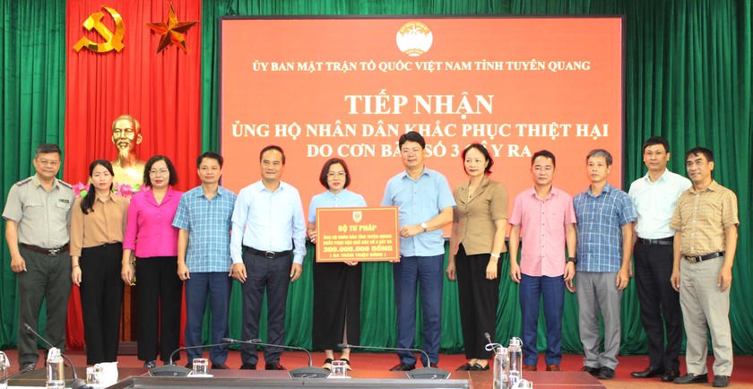 Đại diện Bộ Tư pháp, Thứ trưởng Nguyễn Thanh Tịnh trao số tiền 300 triệu đồng tới MTTQ tỉnh Tuyên Quang. |