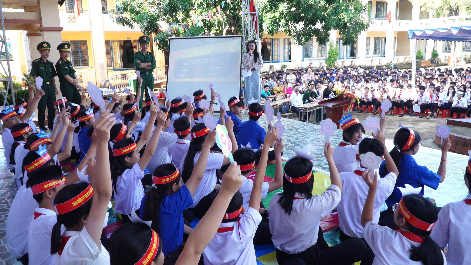 Phát biểu tại chương trình, bà Vũ Thị Huyền - Hiệu trưởng trường THCS Đăk Ơ cho biết: “Trường THCS Đăk Ơ chúng tôi là 1 điểm trường đặc thù khi có hơn 30% các em học sinh là người dân tộc thiểu số, do đó vấn đề tuyên truyền, phổ biến, giáo dục pháp luật cho các em, nhất là về Luật Trẻ em là điều luôn được chúng tôi quan tâm và đẩy mạnh phối hợp cùng các đơn vị thực hiện.