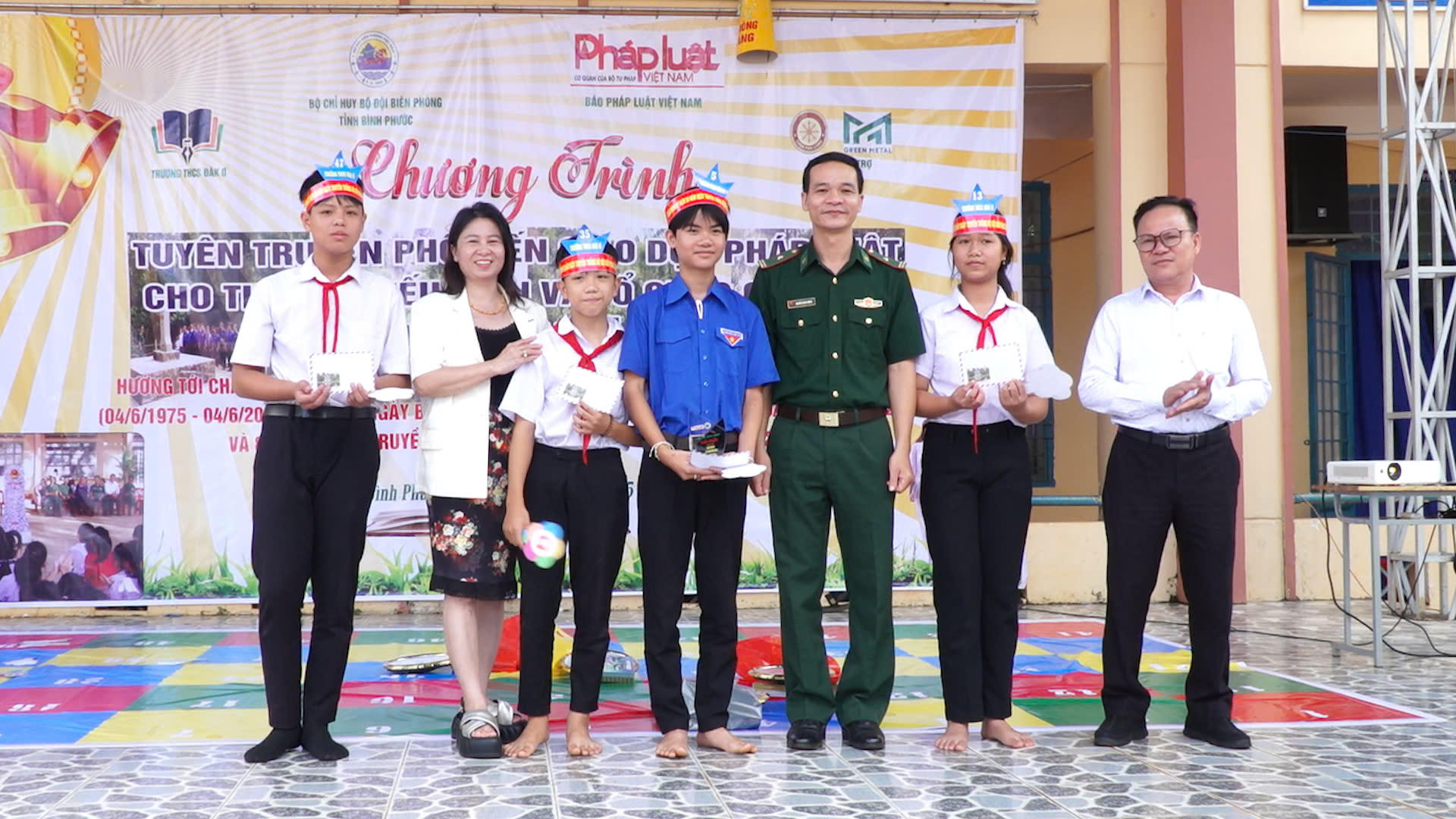 (PLVN) - Trong khuôn khổ chương trình “Về với vùng biên” năm 2025, vừa qua, Báo Pháp luật Việt Nam phối hợp cùng Bộ Chỉ huy Bộ đội Biên phòng tỉnh Bình Phước tổ chức chương trình “Rung chuông vàng” tại điểm trường THCS Đăk Ơ, huyện Bù Gia Mập. Đây là một trong chuỗi các hoạt động hai đơn vị phối hợp hướng tới chào mừng kỷ niệm 50 năm Ngày Truyền thống Bộ đội Biên phòng (BĐBP) tỉnh Bình Phước (04/6/1975 – 04/6/2025); 40 năm Ngày Báo Pháp luật Việt Nam ra số đầu tiên (10/7/1985 – 10/7/2025) và 80 năm Ngày Truyền thống Ngành Tư pháp (28/8/1945 – 28/8/2025).