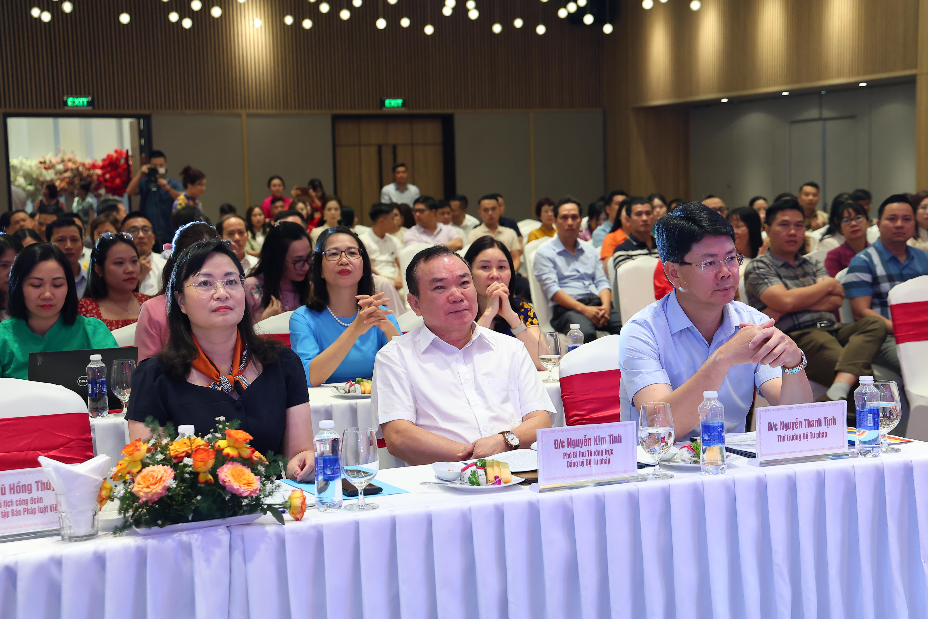 | Ông Nguyễn Thanh Tịnh - Thứ trưởng Bộ Tư pháp, ông Nguyễn Kim Tinh - Phó Bí thư thường trực Đảng ủy Bộ Tư pháp; bà Vũ Hồng Thúy - Phó Tổng biên tập Báo PLVN tại Hội nghị. |