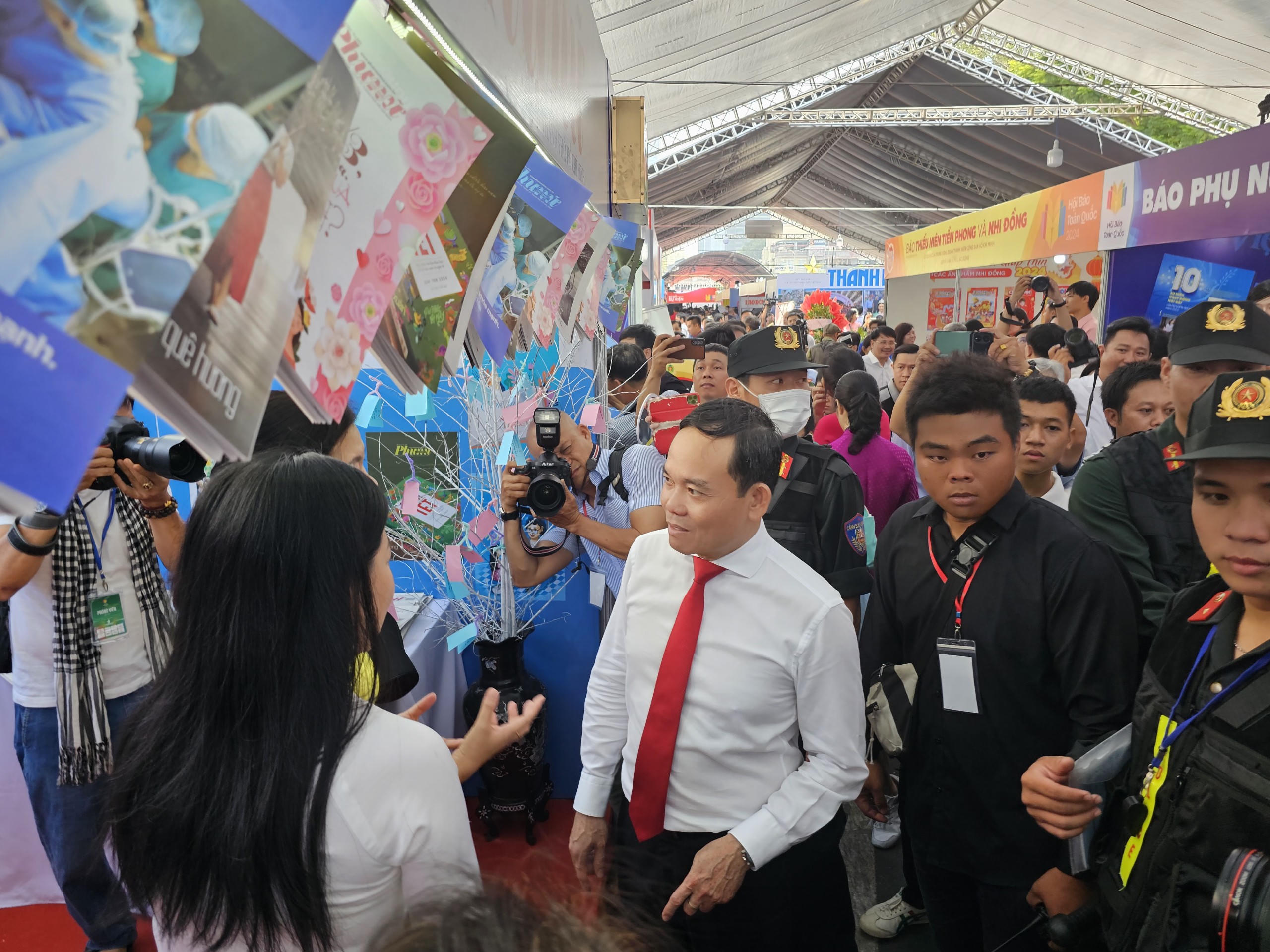 Phó Thủ tướng Chính phủ Trần Lưu Quang tham quan các gian hàng trưng bày báo chí. |