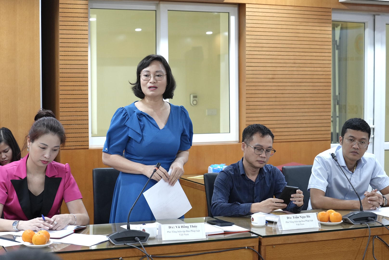 Bà Bùi Thị Thu Hằng, Trưởng Ban Nội chính, Báo PLVN đề xuất Tổng cục THADS tăng cường phối hợp trong việc đưa tin các tuyến bài về THADS; các loạt bài có chủ đề, có trọng tâm, trọng điểm, tuyên truyền về các vấn đề “nóng”, được dư luận, xã hội quan tâm trong công tác THADS.
