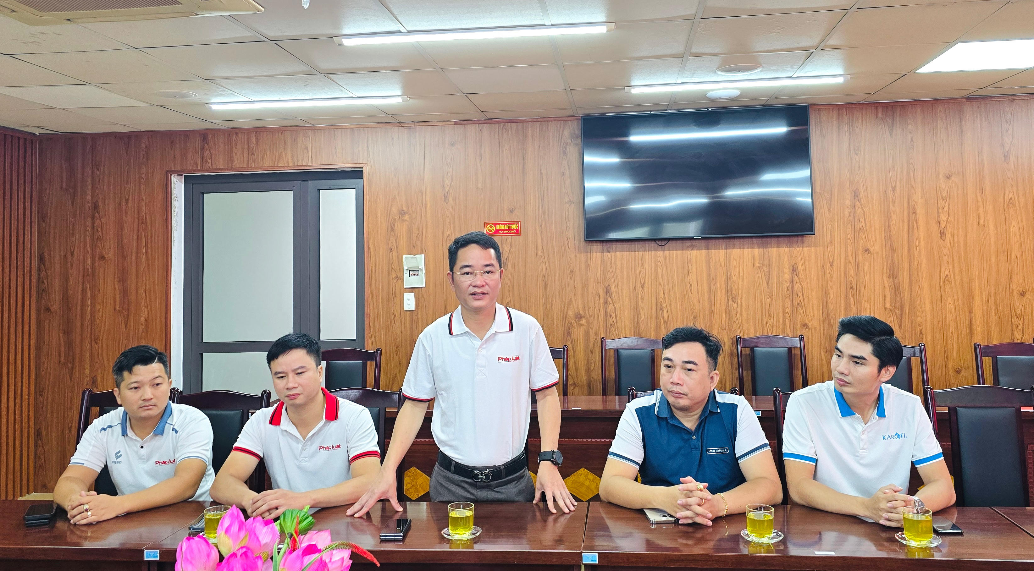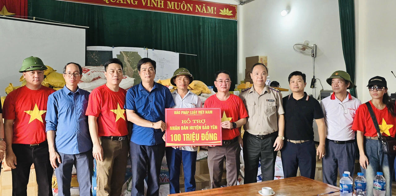 Tổng Biên tập Báo Pháp luật Việt Nam và đoàn công tác trao tiền ủng hộ nhân dân huyện Bảo Yên. |