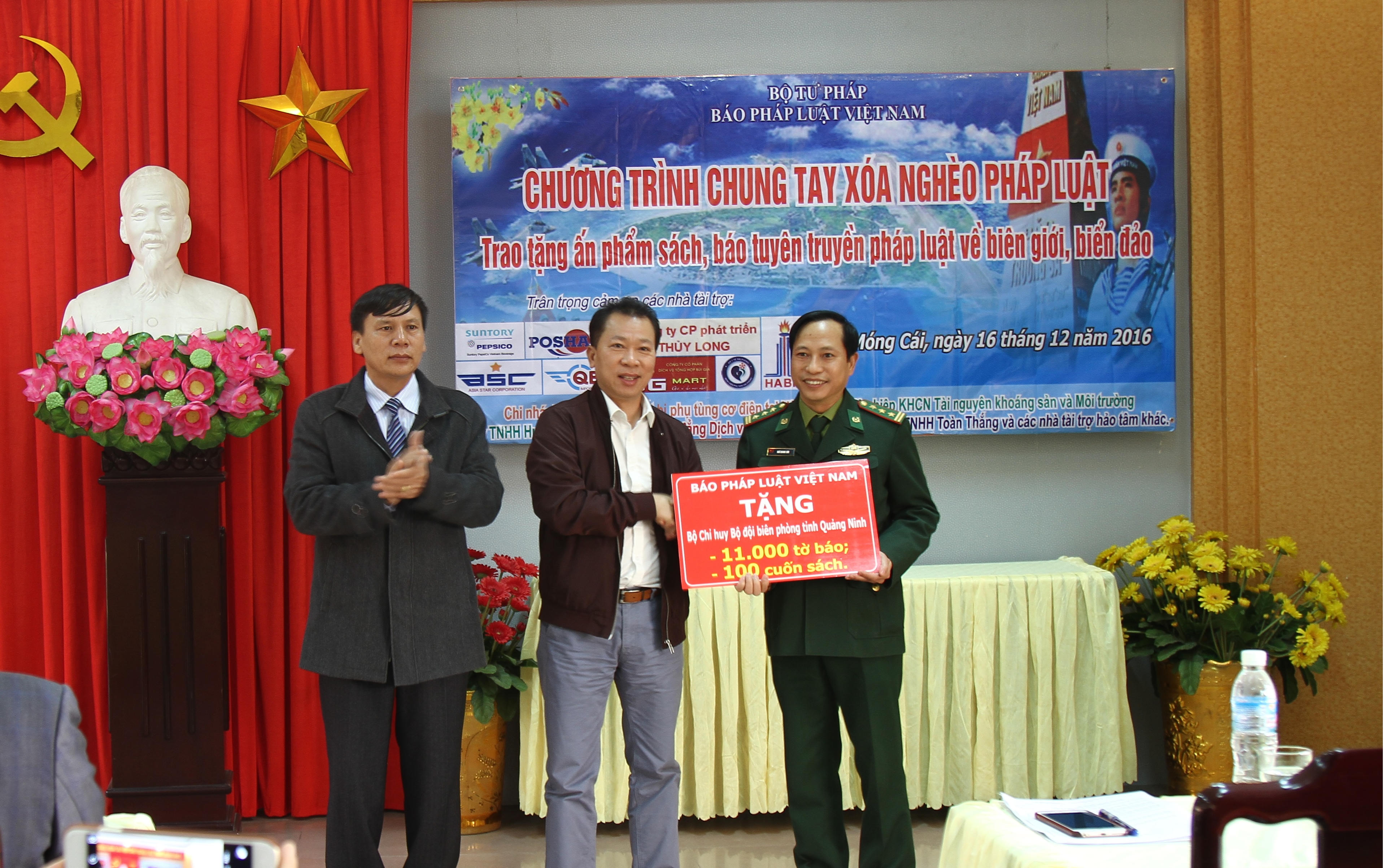 Hôm nay, 16/12, 11.000 tờ báo, 100 cuốn sách đã được trao tặng tới Bộ chỉ huy BĐBP tỉnh Quảng Ninh; 5.500 tờ báo, 200 cuốn sách đã được trao tặng tới TP Móng Cái; 3.600 tờ báo, 100 cuốn sách đã được trao tặng tới UBND huyện Vân Đồn. Bắt đầu từ 1/1 đến hết 31/12/2107, các ấn phẩm của báo Pháp Luật Việt Nam sẽ được phát hành tới 30 đồn biên phòng của Bộ chỉ huy BĐBP tỉnh Quảng Ninh; 15 xã, phường của TP Móng Cái, UBND huyện Vân Đồn.