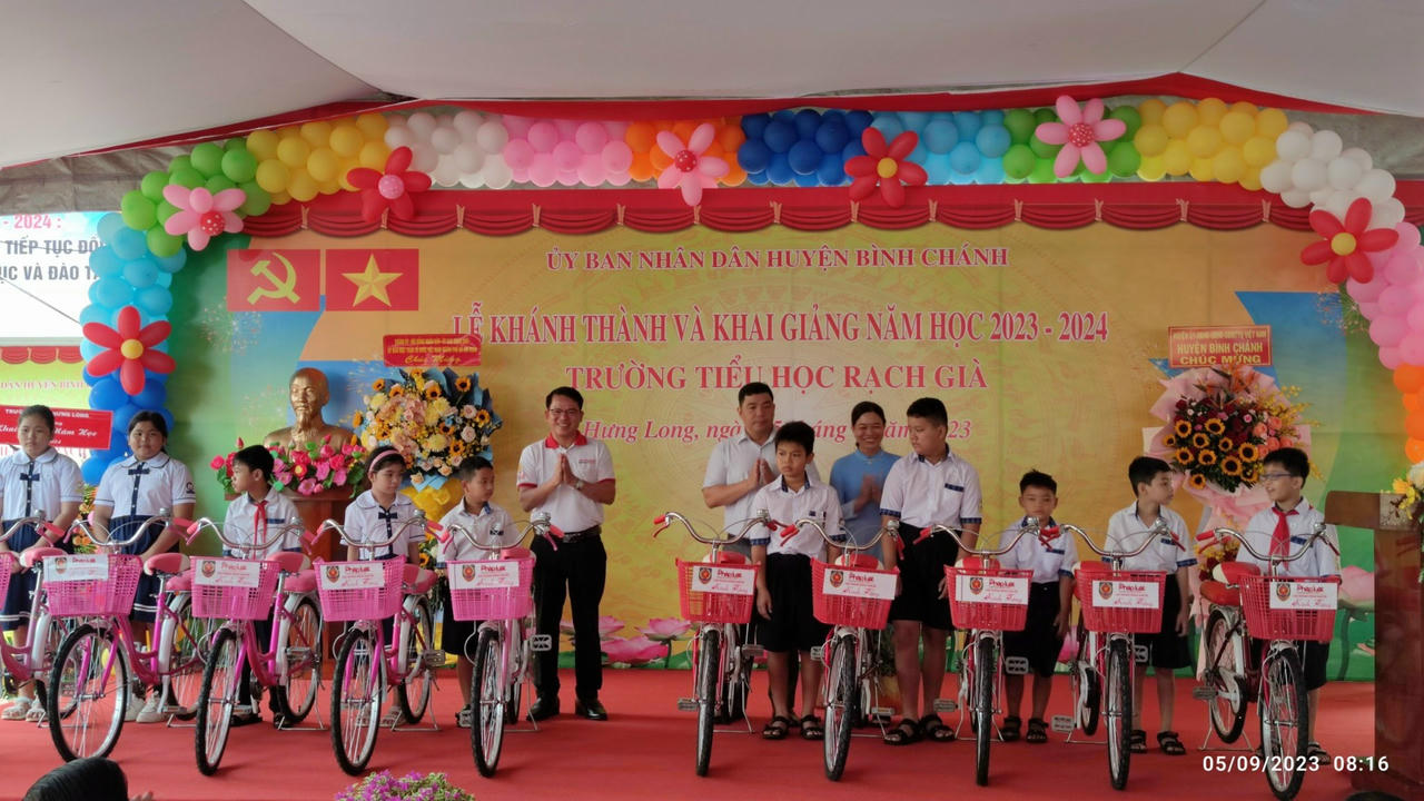 Tham dự lễ khánh thành và khai giảng năm học mới tại trường tiểu học Rạch Già, Báo Pháp luật Việt Nam - Văn Phòng Đông Nam Bộ cũng đã trao tặng 50 xe đạp, trị giá 100 triệu đồng cho các học sinh nghèo của xã Hưng Long. Đây là những em có một hoàn cảnh khó khăn khác nhau, nhưng đều có điểm chung là nỗ lực, vượt nghịch cảnh, vươn lên trong cuộc sống.