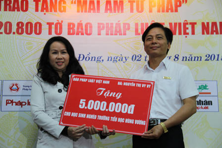Cũng tại buổi lễ, bà Nguyễn Thị Vy Vy – một nhà hảo tâm sinh sống tại tỉnh Lâm Đồng đã thông qua Báo PLVN, trao tặng cho học sinh nghèo trường Tiểu học Hùng Vương, TP. Đà Lạt số tiền 5 triệu đồng.